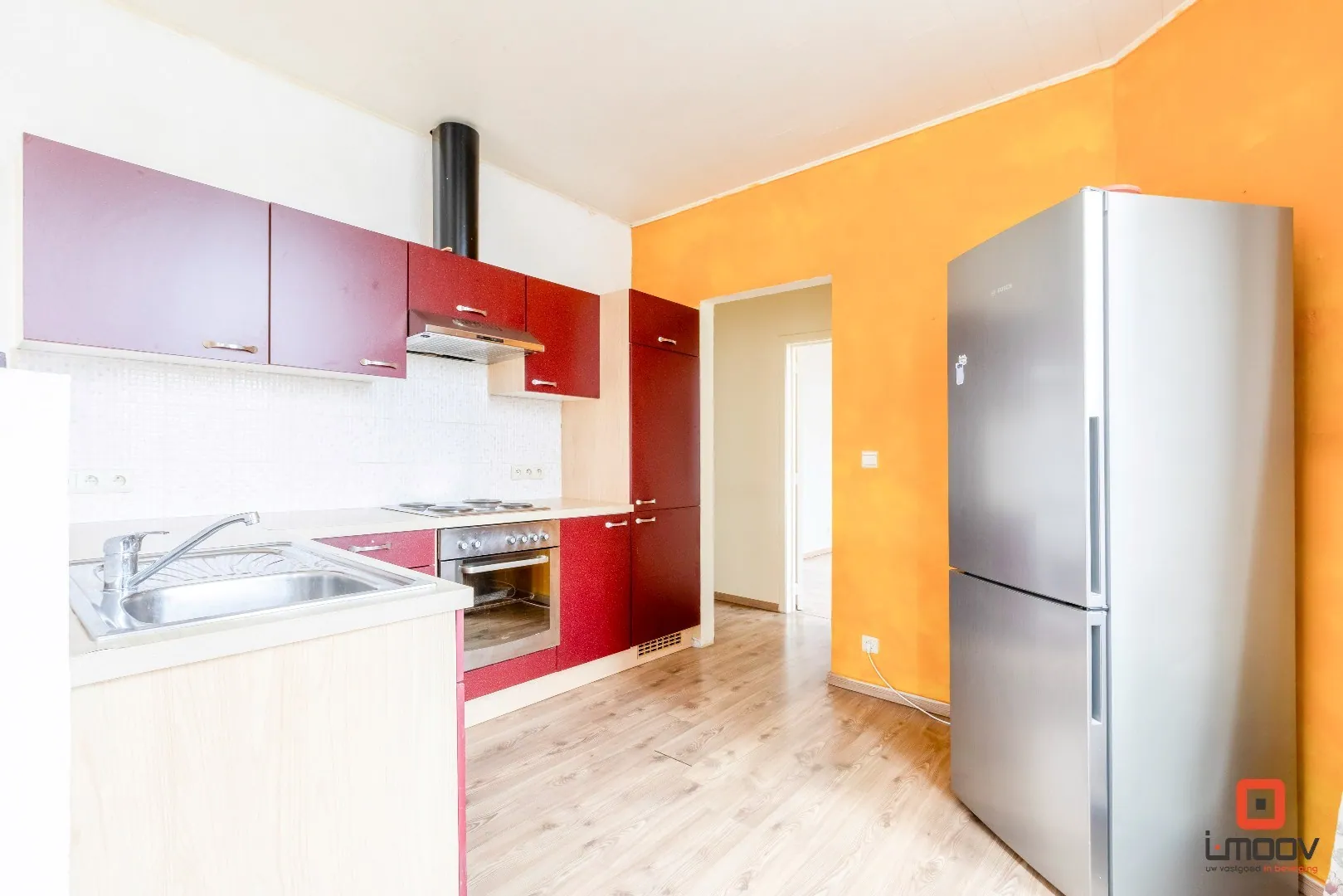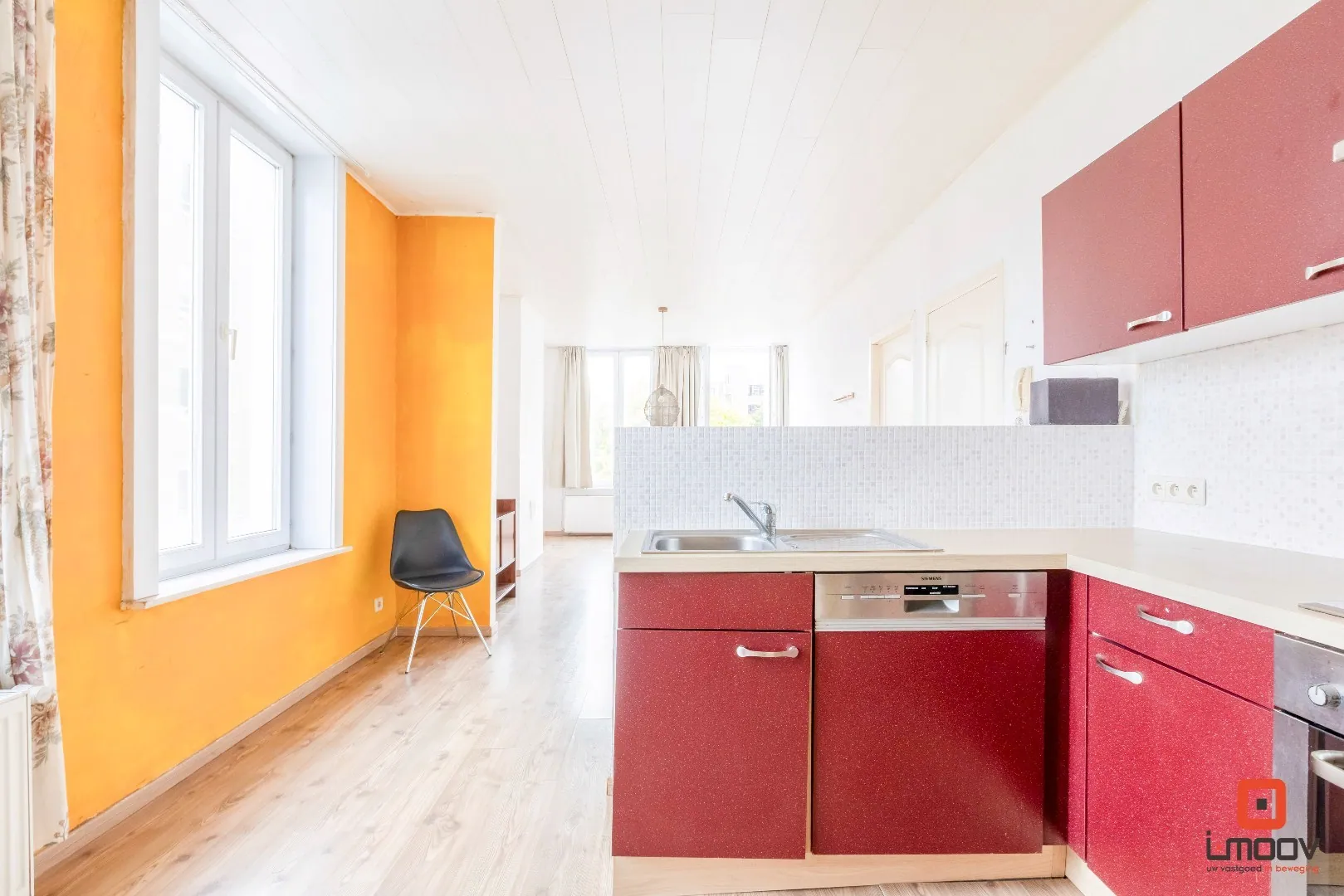 De open keuken sluit mooi aan op de leefruimte. De laminaatvloer zorgt voor een warme uitstraling en een onderhoudsvriendelijke afwerking.