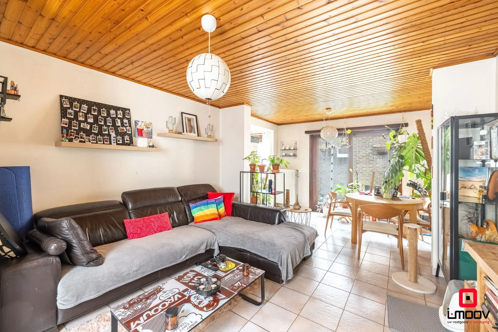 Binnenin wordt u verwelkomd in een warme en lichtrijke leefruimte, waar grote glaspartijen zorgen voor een directe connectie met het aangename terras. Dit vormt een natuurlijke verlenging van de woonruimte en biedt een ideale plek om tot rust te komen.